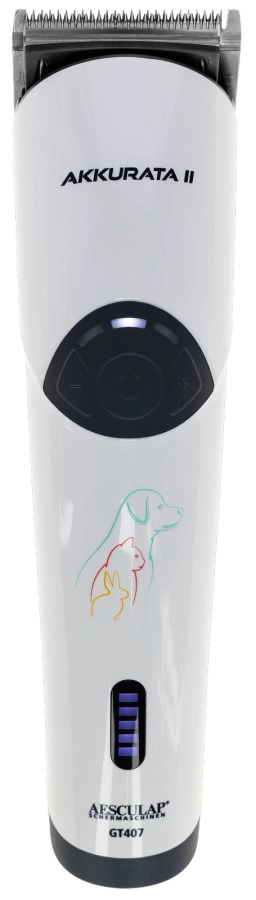 Die komplett überarbeitete Tierschermaschine Akkurata II mit 3 Geschwindigkeitsstufen überzeugt mit einem neuen, leistungsstarken Akku für bis zu 3 Stunden Laufzeit, sowie mit einer elektronischen Leistungssteuerung "Speed Control", die für ein perfektes Schervergnügen sorgt.