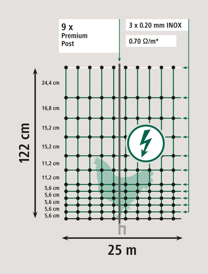 - Gesamthöhe 137 cm = 11 horizontale Litzen (Netzhöhe 122 cm + Erdspiess 15 cm)