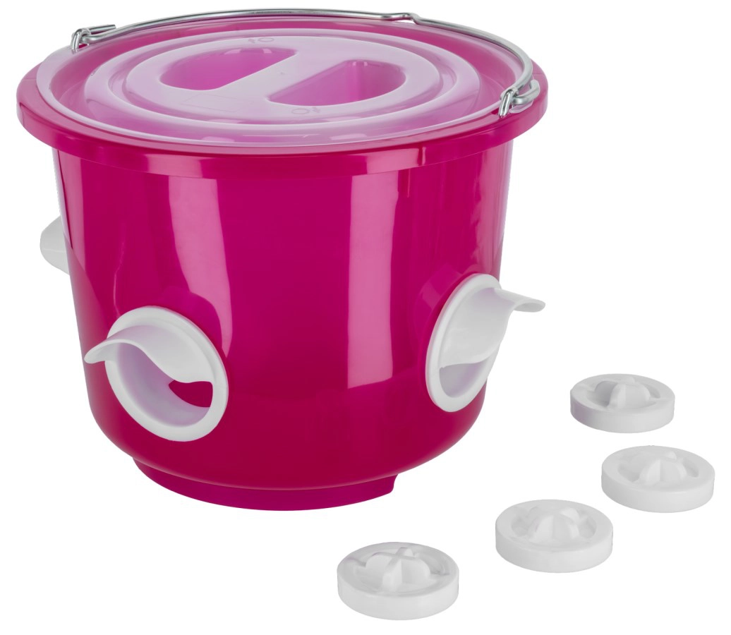 Praktischer Futtereimer mit 4 verschließbaren Öffnungen, pink-transparent für Füllstandskontrolle, inklusive Deckel sowie Edelstahlgriff, flexibel zum Aufhängen oder Hinstellen.