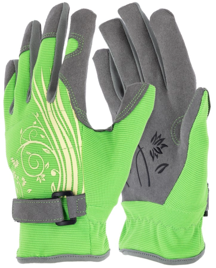 Genähter Gartenhandschuh aus Mikrofaser, Spandex und Nylon mit elastischem Handrücken und Klettverschluss – angenehm zu tragen, flexibel und passgenau. Ideal für Damen und verschiedene Gartenarbeiten.