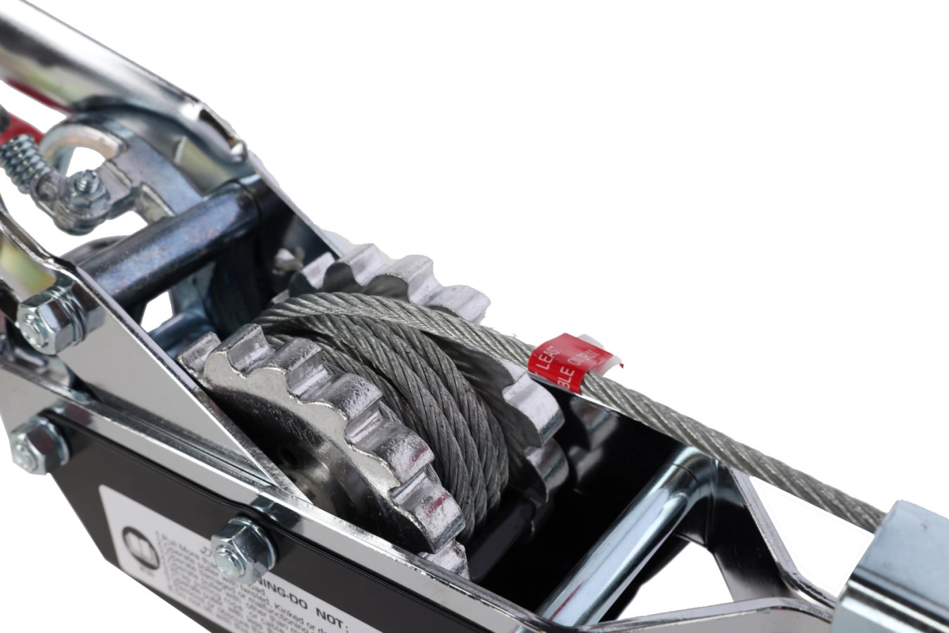 Praktisch: Das stabile, drallfreie Stahlseil des Handseilzugs mit Umlenkrolle erleichtert das Lenken auch in schwierigem Gelände und erhöht die Zugkraft der Seilwinde.