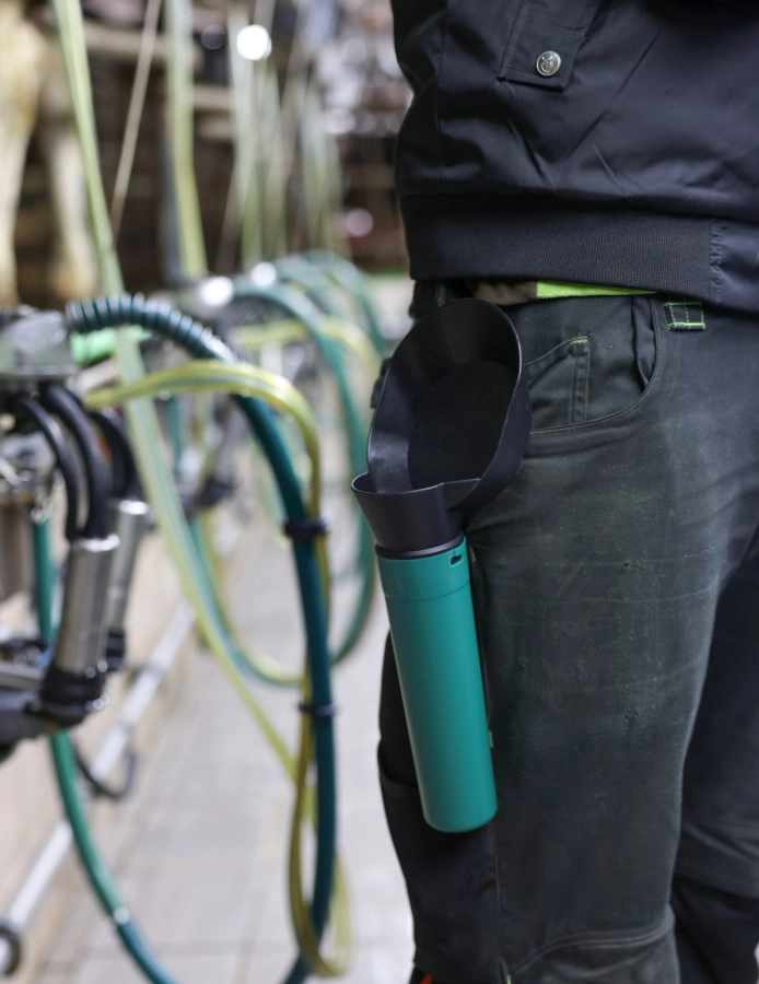 Vormelkbecher zum Prüfen von Milchqualität und Eutergesundheit vor dem Melken mit praktischem Gürtelhaken.